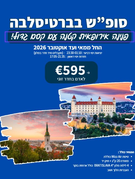 בירת סלובקיה הקסומה משלבת עיר עתיקה מקסימה עם טירה מרשימה המשקיפה על הנהר. רחובות מרוצפים, קפה וינאי אותנטי, ומחירים נוחים במיוחד. קרובה לווינה (שעה בלבד!), מושלמת לסוף שבוע רומנטי או כחלק ממסע באירופה המרכזית. יעד מפתיע שמרגיש כמו סוד שמור!