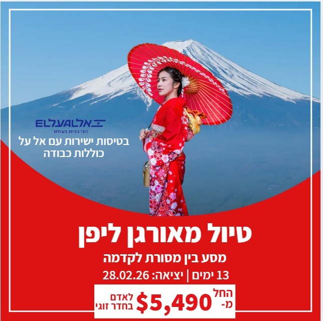חוויה יפנית מושלמת! מטוקיו הסוערת דרך הרי האלפים היפניים לקיוטו המסורתית. טיסות ישירות, שינקנסן מהיר, ולינות נוחות עם ארוחות בוקר. נבקר בטירות זהובות ומקדשים עתיקים, נראה את פסל הגונדם הענק והטכנולוגיה העתידית, נשקיף על הר פוג'י המושלג ואגם האקונה הטורקיז, ונגיע לשיראקאווה-גו - כפר מורשת אונסקו עם גגות הקש. נטייל בחורשת הבמבוק, נבקר במקדש הזהב ונשתתף בטקס תה מסורתי. המסע כולל שווקים תוססים, אוכל יפני אותנטי וקניות ברובעי האופנה. מסע מושלם המשלב נופים עוצרי נשימה, תרבות עשירה וחוויות בלתי נשכחות - יפן, המקום שבו העבר והעתיד חיים בהרמוניה מושלמת!
